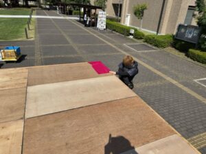 ステージの高さは一応1200mmらしいけど、1ケ所だけしか揃わない程地面は傾斜してるんだってよ。