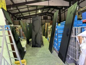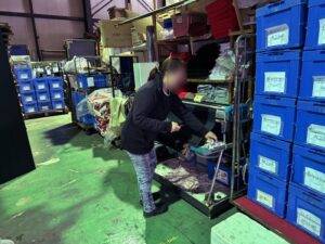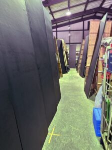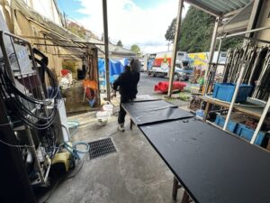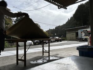 お天気が悪いもんでさぁ~、全部倉庫の中に干さないといけなかったんで動線が無くなってた。