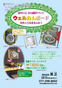 エッチングでウエルカムボードを作れるよって案内。サンドブラストって手法でガラスや鏡を削って作るんだ。