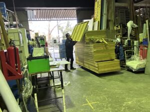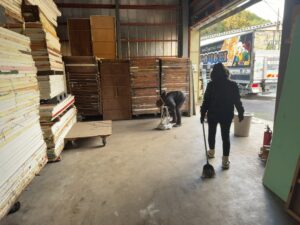 その頃、MMさんとOMさんはB倉庫へ。明日、同業者さんがパネルを見に来て下さるそうで、社長が2人に掃除を頼んでたみたい。
