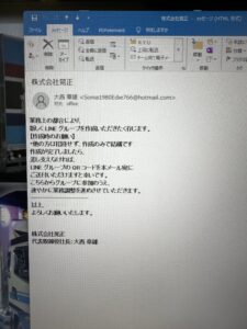 これ、その中の1件のメールの写真なんだって。「差出人の俺のアドレスが全然知らんアドレスになってるから直ぐに分かってしまうとは思うけど、気をつけろよ」