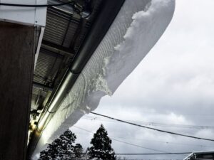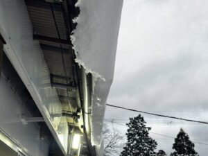 帰りに気が付いたんやけど、事務所の屋根の雪がつららの様に下がったまま凍ってた!