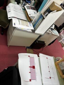 今日の社長は結局天気が悪いので、卒業式の図面や伝票などの事務ワークに変更されたみたいです。