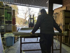 エレベーターの中の正面が鏡張りなんだそうで直接物が当たったらひび割れちゃうかもしれんそうなんで、パンチ張りの面を鏡に当ててベニヤ面で衝撃を止める養生を作ってた訳だそうですわ。