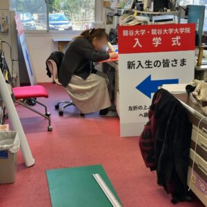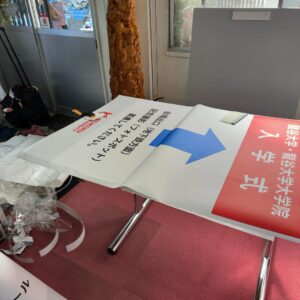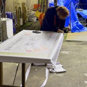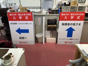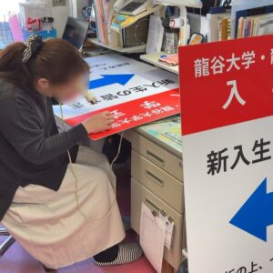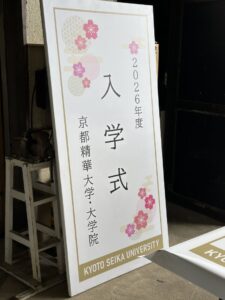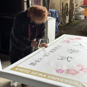 ステージのタイトル貼りみたいだね。社長は龍谷大学様の誘導看板の作成。